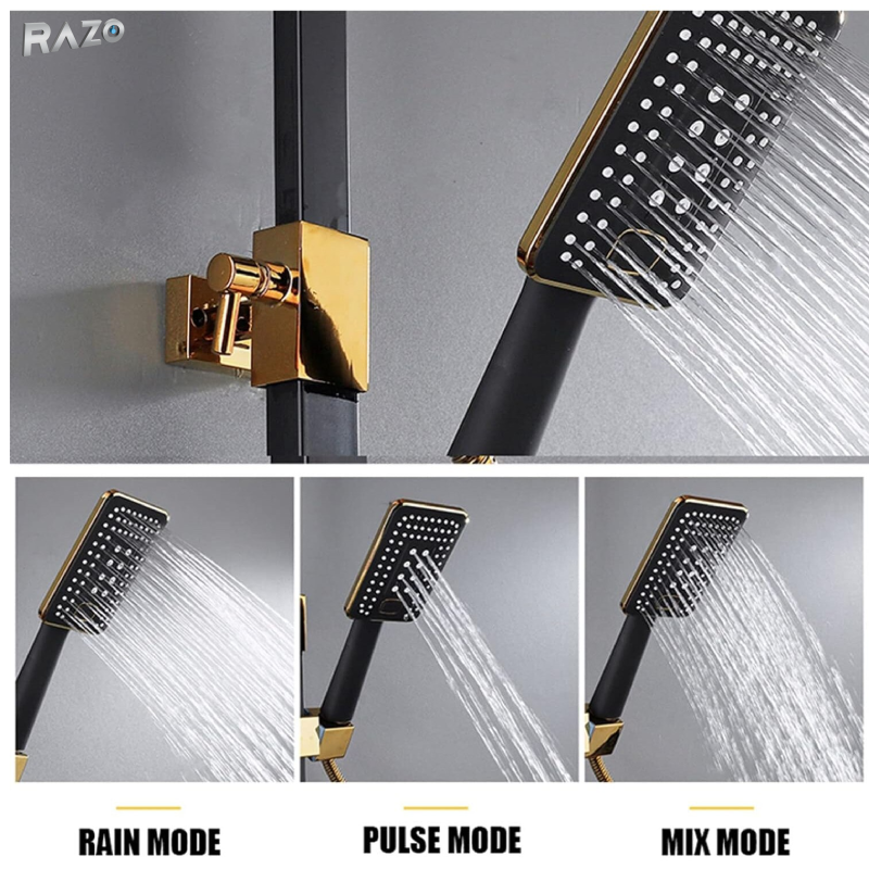 Setul de dus negru/auriu este alegerea ideala pentru cei care doresc un produs elegant, performant si durabil, oferind o experienta de dus premium in fiecare zi.