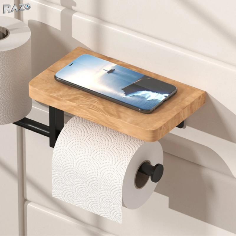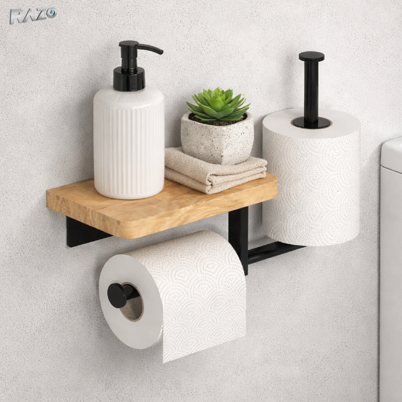 Suportul pentru hartie igienica cu raft din lemn este solutia ideala pentru o baie organizata si moderna. Cu un design elegant in combinatie de negru si maro natur, acest accesoriu imbina perfect utilitatea cu estetica, oferind spatiu atat pentru role de hartie, cat si pentru obiecte esentiale de zi cu zi.