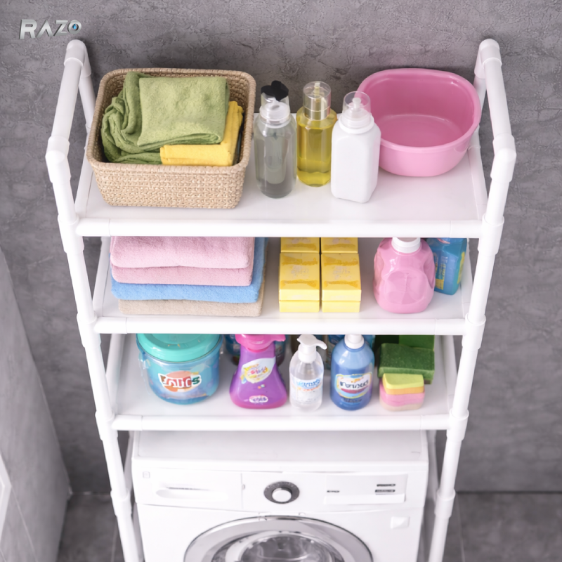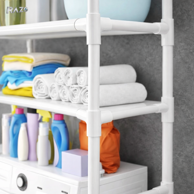 Optimizeaza spatiul din baie sau spalatorie cu suportul organizator Razo pentru masina de spalat, prevazut cu 3 polite spatioase si cadru metalic rezistent. Conceput pentru a utiliza eficient spatiul de deasupra masinii de spalat, acest raft vertical ofera depozitare suplimentara fara a ocupa loc pe podea.