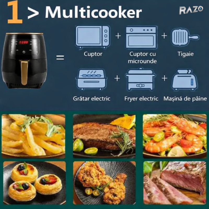 Prepara mese gustoase si mai sanatoase cu friteuza fara ulei cu aer cald Razo, cu putere mare de 2400W si capacitate generoasa de 6 litri. Ideala pentru intreaga familie, aceasta friteuza cu aer cald permite gatirea cu putin sau fara ulei, reducand aportul de grasimi fara a compromite gustul si textura crocanta.