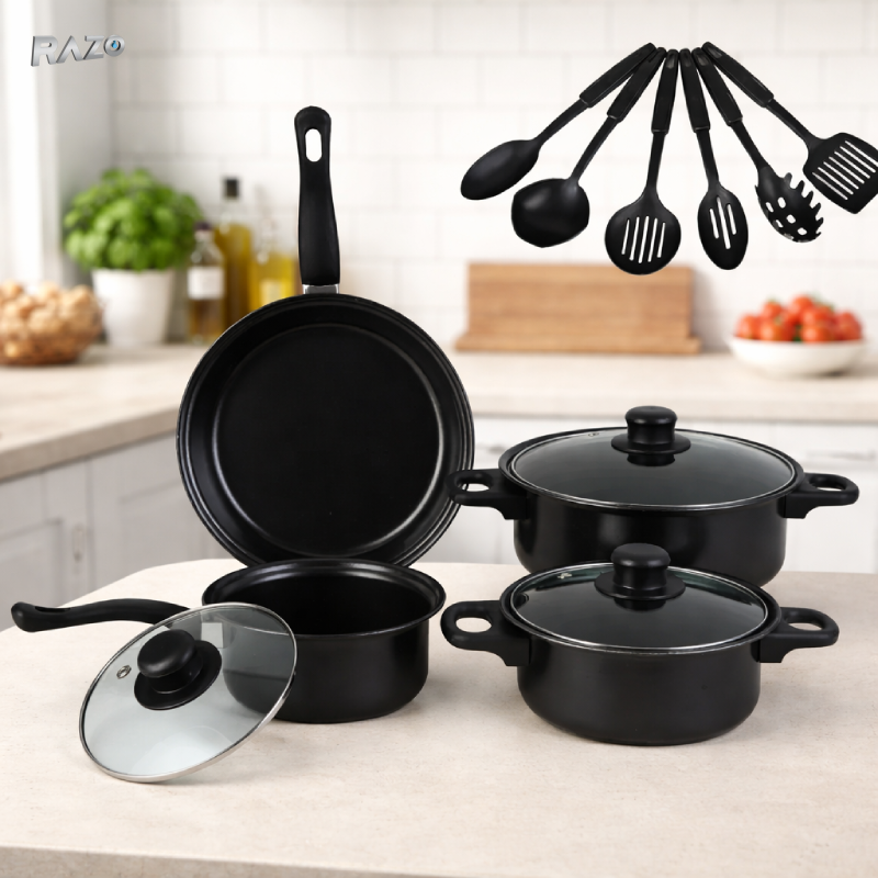 Completeaza-ti bucataria cu setul premium mini de oale si ustensile pentru gatit, format din 13 piese esentiale pentru prepararea zilnica a mancarurilor. Ideal atat pentru bucataria de acasa, cat si pentru camping sau spatii restranse, acest set ofera versatilitate, durabilitate si design modern in culoare negru elegant.