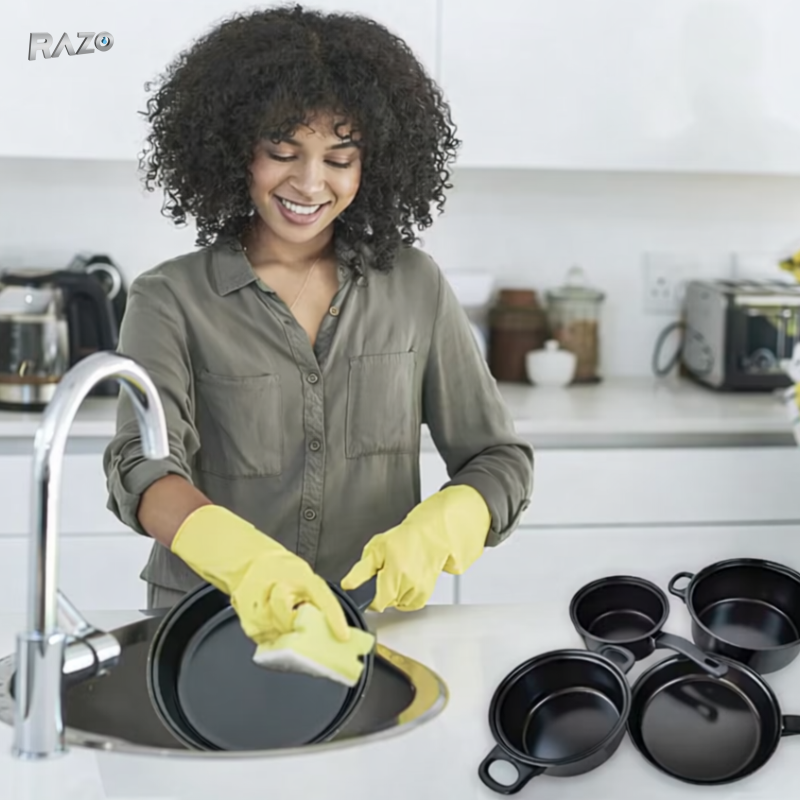 Desi setul este compatibil cu masina de spalat vase, se recomanda spalarea manuala cu apa calda si detergent delicat pentru a mentine aspectul si durabilitatea stratului antiaderent pentru o perioada mai lunga.