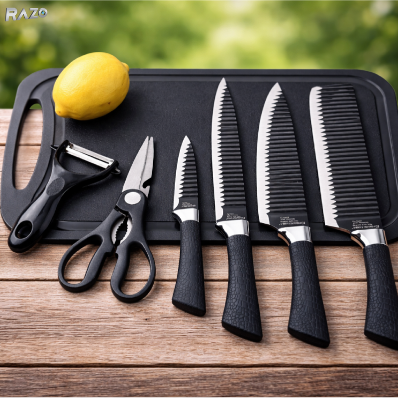 Setul 6 Piese Bucatarie – Cutite Premium, Decojitor si Foarfeca Multifunctionala este o alegere inspirata pentru oricine iubeste gatitul. Elegant si practic, acest set adauga eficienta si stil oricarei bucatarii.