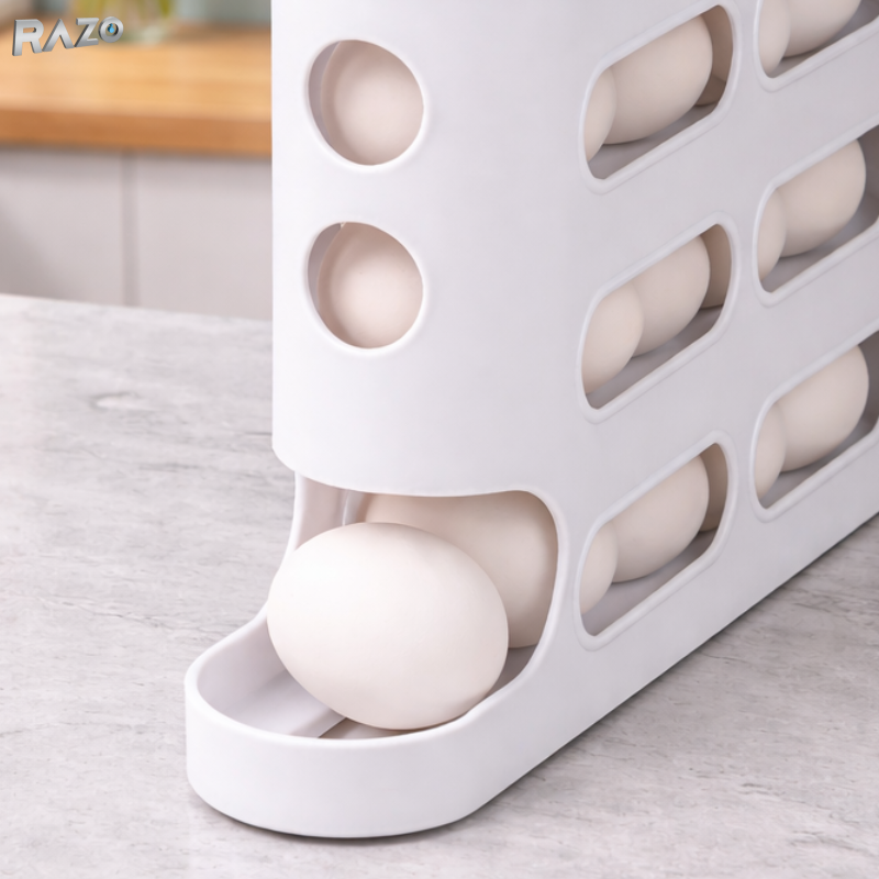 Suportul pentru oua cu sistem de rulare automata este un accesoriu modern si practic pentru bucatarie. Designul vertical pe 4 niveluri permite organizarea eficienta a oualor, iar sistemul inteligent face ca acestea sa coboare automat in fata pe masura ce sunt scoase.