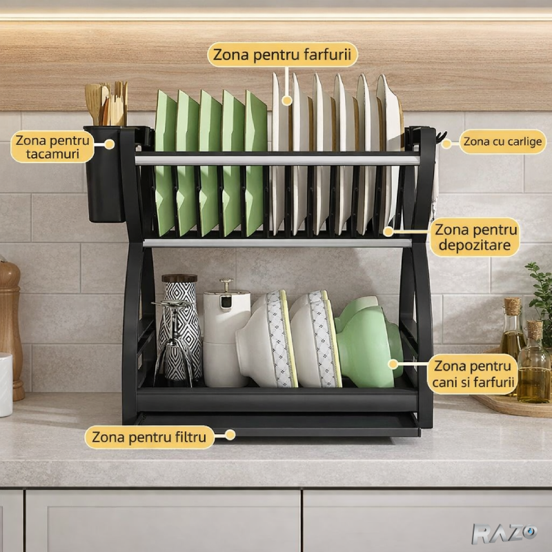 Organizeaza eficient bucataria ta cu acest suport de vase multifunctional, conceput pentru uscare rapida si depozitare practica. Designul modern si compartimentarea inteligenta il fac ideal pentru orice tip de bucatarie.