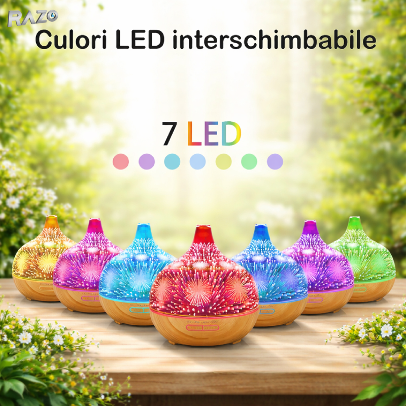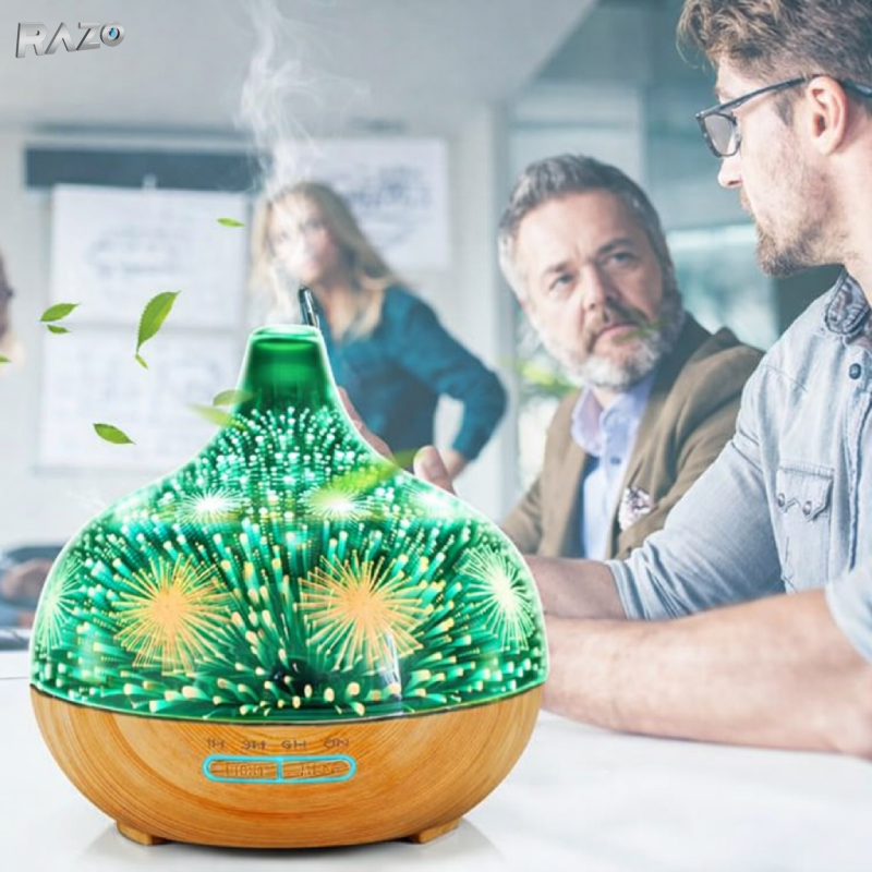 Difuzorul de aroma 3D cu ultrasunete este solutia ideala pentru imbunatatirea calitatii aerului si crearea unei atmosfere relaxante in casa sau la birou. Cu design elegant tip "artificii" si finisaj aspect lemn deschis, acest dispozitiv combina functia de umidificator, difuzor de aroma si lampa ambientala.