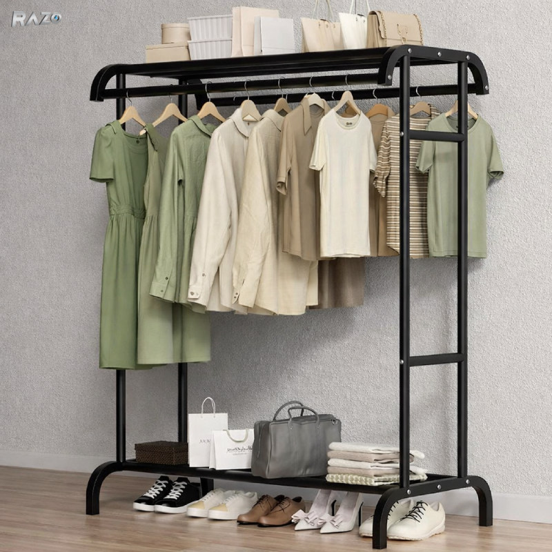 Acest suport haine cu bara dubla reprezinta o alternativa practica la dulapul clasic, fiind ideal pentru dressinguri deschise sau spatii mici unde este necesara optimizarea locului disponibil.