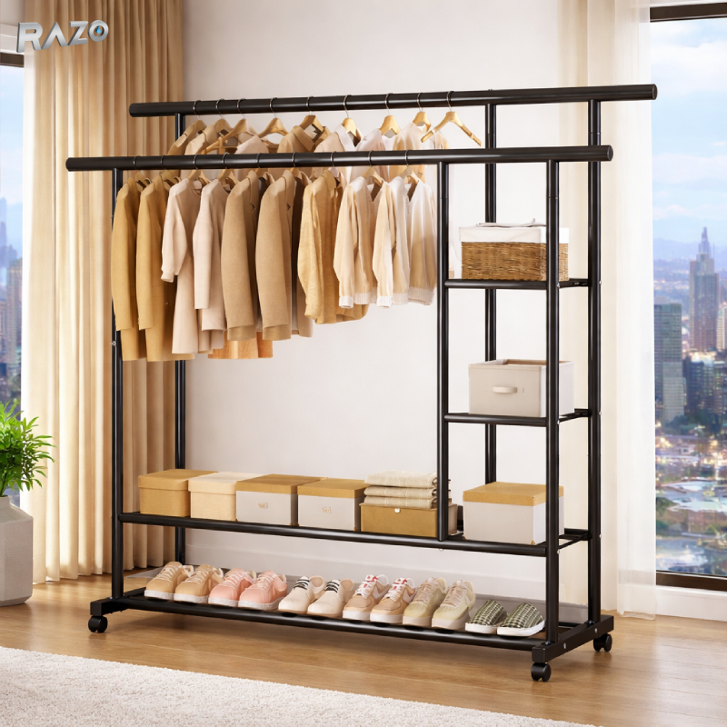 Suportul pentru haine cu rafturi este solutia ideala pentru organizarea eficienta a spatiului din locuinta, oferind stabilitate, capacitate mare de depozitare si un design modern.