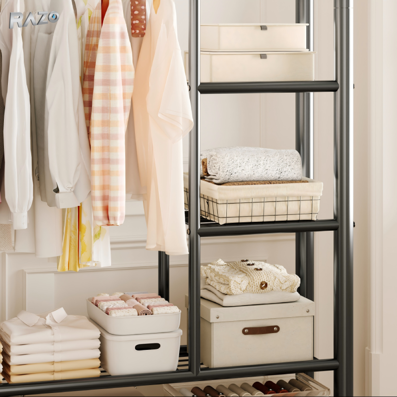 Organizeaza-ti eficient hainele, incaltamintea si accesoriile cu acest suport pentru haine cu rafturi, robust si multifunctional. Conceput pentru a economisi spatiu, acesta poate fi folosit atat ca suport pentru umerase, cat si ca raft pentru depozitare.
