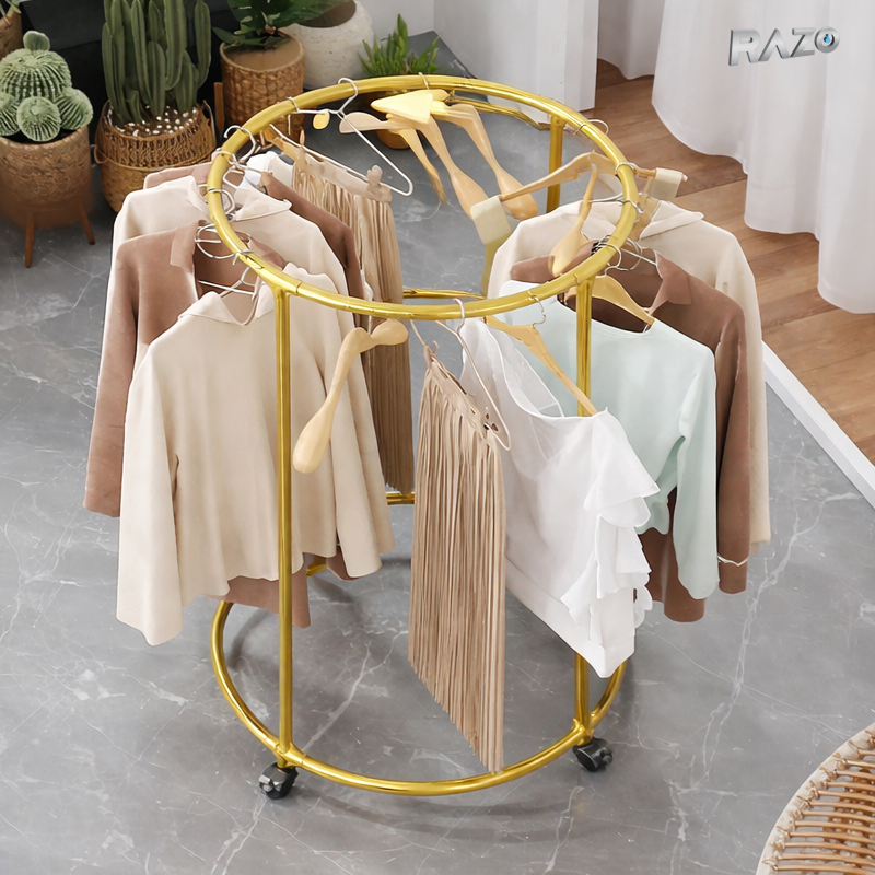 Adauga un plus de eleganta si rafinament spatiului tau cu suportul rotativ pentru haine, realizat din otel inoxidabil cu finisaj auriu lucios. Ideal pentru haine grele, acest suport imbina designul minimalist cu stabilitatea si functionalitatea.