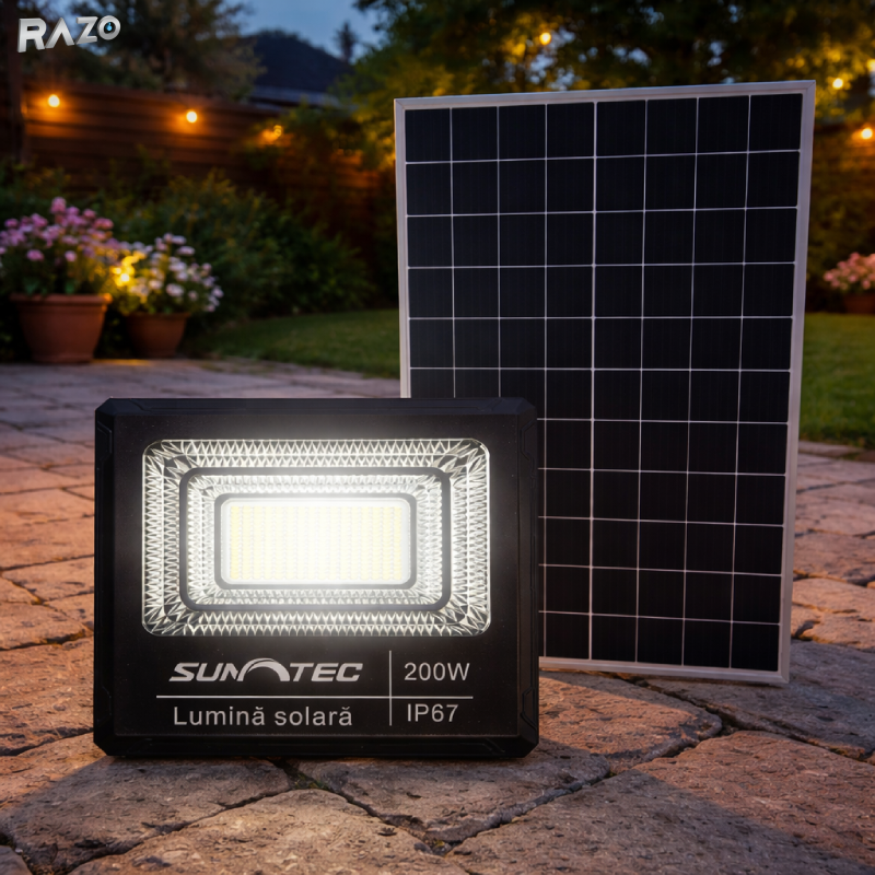 Proiectorul LED solar 200W este solutia ideala pentru iluminat exterior eficient si economic, functionand pe baza de energie solara fara consum de electricitate