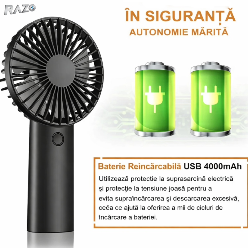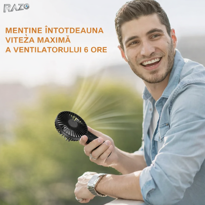 Ventilatorul mini portabil Razo iti ofera racorire eficienta si confort oriunde te afli.